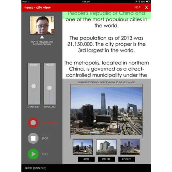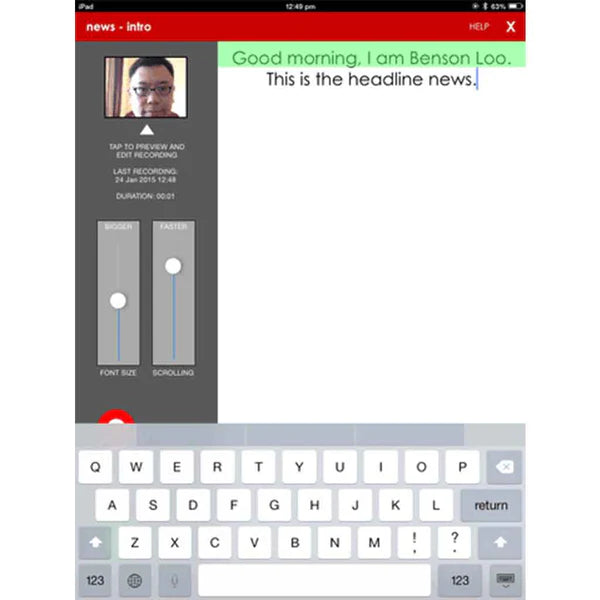 In step 2 the computer then serves as a teleprompter, and the 'news anchor' reads the story aloud for practice, then makes a recording. Built-in face-tracking, blue-screen and other fun video technologies makes it easy to overlay impressive visual effects. Students can also import video that they have shot at other locations making this an ideal way of bringing together information, video and sound from a previous events such as a school excursion.