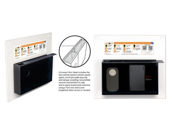 For wall recessing, the UConnect Mini is a steel, low profile hearing augmentation solution. Approx. 315 x 280 mm, UConnect Mini is prebuilt by Hear and Learn and comes to site for connection to electricity (no on-wall power points or cables) and prewired inputs from PA speaker, screens and any other audio. UConnect Mini to be installed in view and reach of learners, teachers and visitors. Soundfield can be added to the UConnect Mini when storing and securing mikes is not a priority. Out of view and touch components include our bespoke electronics which transform and balance audio input, and most cabling.